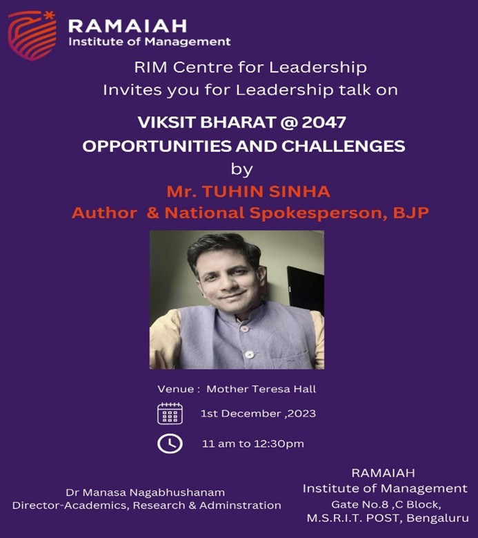 A leadership talk was organized by the Centre for Leadership for the faculty and students at Ramaiah Institute of Management on “Viksit Bharat @2047: Opportunities and Challenges”. The resource person Mr. Tuhin Sinha, author and National Spokesperson of BJP highlighted the scope and importance of India as a developed nation and how the country has progressed in the recent years due to technological interventions.